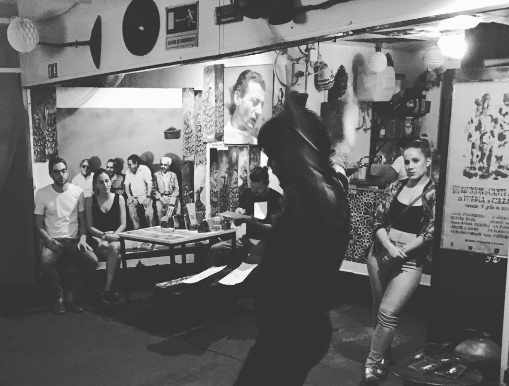 After an hour of cheap red wine in the hot bar, the flamenco show began. A man stood on the stage and said things I couldn’t hear over the roar of the crowd that had gathered, filling all remaining seats and leaning against the walls. He sat down on a bench near my feet, next to a guy tuning a guitar. Two other men sat on the bench: a man in a pink polo shirt, and a man with slicked back black hair a white button up shirt with the leaves rolled up, and a vest.