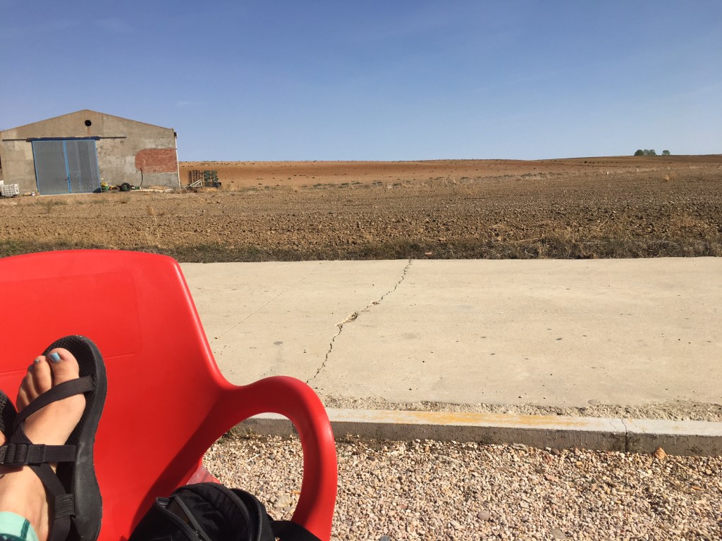 The flatness of the Meseta astounds and annoys me. I don’t understand it. I come from a place with mountains and trees, where you need to climb up on something to see far away but the views are gorgeous at any level of visibility. But this place… the path goes straight, as far as you can see, and when you get to that spot, the same thing just happens again. I try to be present, but today I had to listen to music, podcasts, comedy, anything. There are few people on this stretch. This is the part people skip, and it shows.
