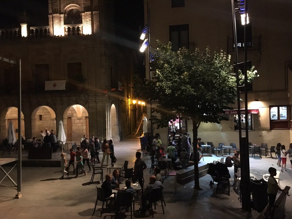 I walked into the plaza to fill my bottle at a fountain and took a moment to observe the streets, so empty that afternoon and so full tonight of drinkers and waiters and families and kids climbing on a stage and kicking footballs and dogs chasing each other. Even an effigy of the infamous Cesare Borgia, killed in this very spot centuries ago and buried under the thoroughfare rather than in a proper crypt, stood in the crowds, included.