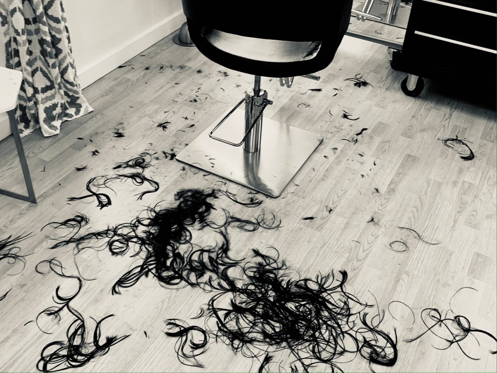 And then she’s got a razor on my neck and it’s too late. Long strands float to the floor. She cuts a fringe and my new bangs fall over my eyes, veiling my sight.